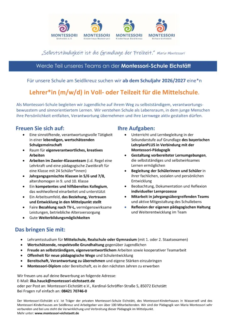 Montessori-Eichstätt e.V. ist Träger der privaten Montessori-Schule Eichstätt, des Montessori-Kinderhauses in Wasserzell und des Montessori-Kinderhauses am Seidlkreuz und Arbeitgeber von über 100 Mitarbeitenden. Wir sind der Pädagogik von Maria Montessori sehr verbunden und bei uns steht die Verwirklichung und Verbreitung dieser Pädagogik im Mittelpunkt. Mehr unter: www.montessori-eichstaett.de