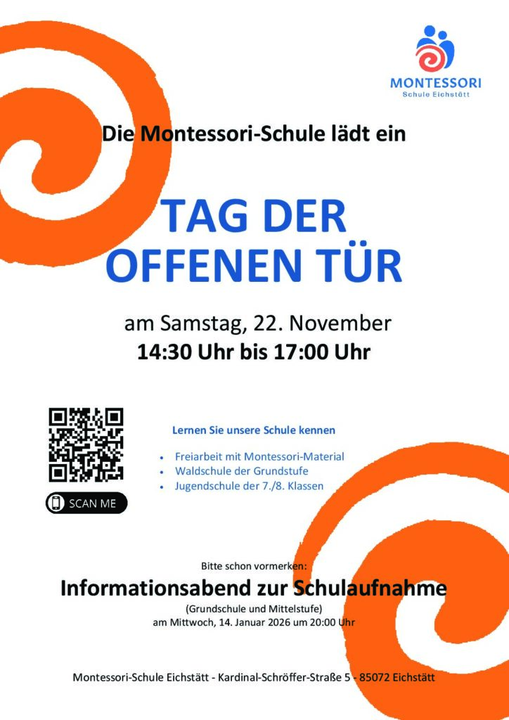 In der Woche vom 1.-4. Dezember besteht die Möglichkeit einen Einblick in die montessorische Arbeitsweise und den Unterricht zu erhalten. Täglich von 8:00 Uhr bis 10:00 Uhr kann sowohl in der Grundstufe (Jgst. 1-4) als auch in der Mittelstufe (Jgst. 5/6) Kindern und Lehrenden während der Freiarbeit über die Schultern geschaut werden.